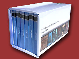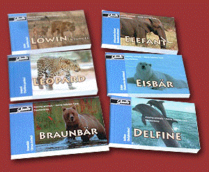 6 Titel der neuen Tierdaumenkino-Serie komplett in einem Schober verpackt.Beobachten Sie Löwe, Eisbär, Braunbär, Delfine, Leopard und Elefant in der freien Natur.